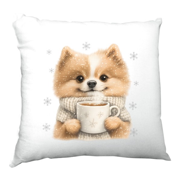 Tento vánoční pomeranian v huňatém svetříku s hrnkem horkého kakaa zahřeje na duši každého milovníka tohoto plemene.