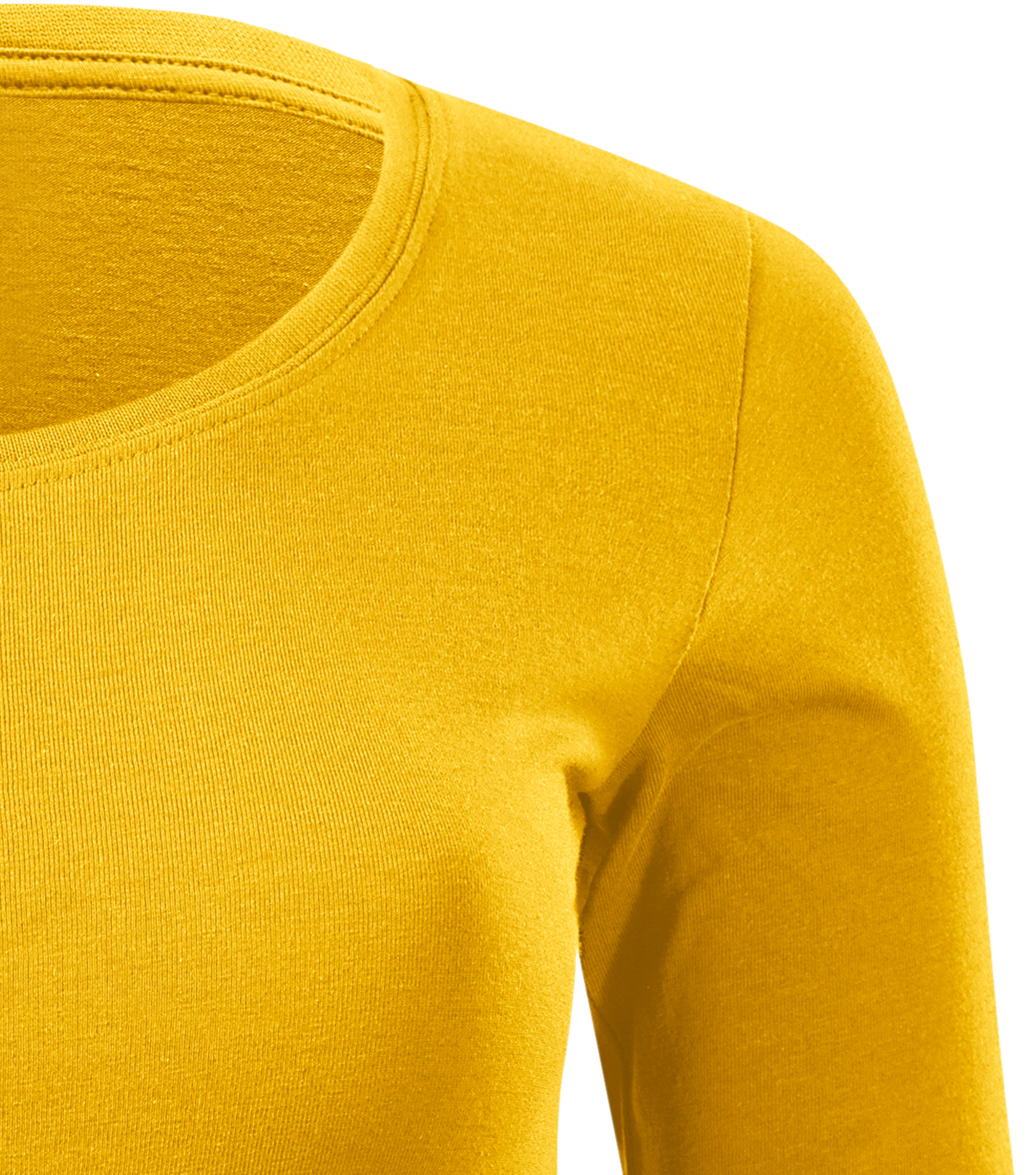 Kvalitní lehce vypasované dámské tričko s dlouhým rukávem, hlubším kulatým výstřihem a s bočními švy. V průkrčníku je zpevňující elastická lemovka z žebrového úpletu v barvě trika a saténová etiketa. Jemný, ale velice odolný bavlněný materiál je příjemný na nošení.